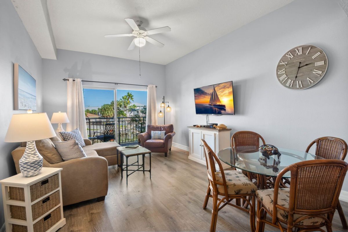 Madeira Bay Resort #207 is a two bedroom, one bathroom condo with a private balcony. View of marina, sunrises, waterway and islands. The master bedroom has a king size bed and the second has a set of bunk beds. Sleeper sofa in the living room. Amenities include a full kitchen, washer and dryer in unit, and free Wi-Fi. This condo is pet friendly. One parking pass provided.
